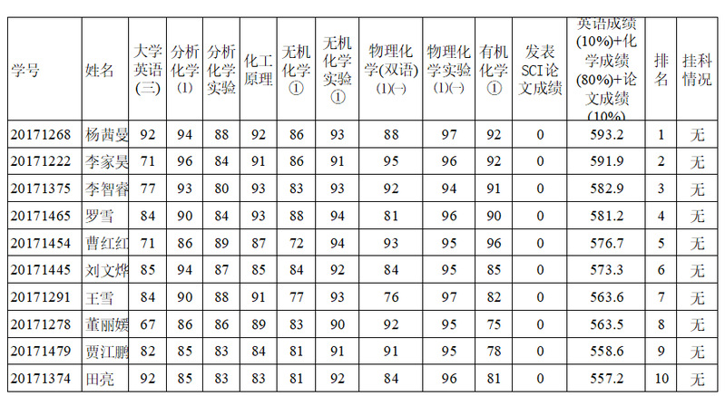 上式中各门课程均以大二学年所修学位课课程,英语课为大学英语(三);化学课包括无机化学①、无机化学实验①、分析化学(1)、分析化学实验、物理化学(双语)(1)(一)、物理化学实验(1)(一)、有机化学①和化工原理;论文指以东北大学为第一单位发表的SCI论文(论文需已on line状态,以100分计,第1、2、3作者权重分别为1.0、0.5、0.2)。