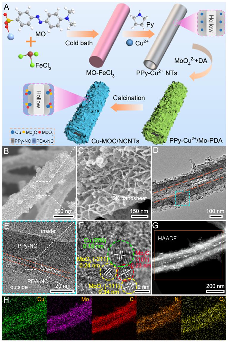 过渡金属碳化物具有较高的导电性和化学稳定性,被认为是极具发展前景的SIBs负极材料。然而,充放电过程中Na+反应动力学迟缓,活性材料体积膨胀严重,极大地阻碍了SIBs的实际应用。澳门六合彩官方-澳门六合彩现场直播结果 王淑兰教授通过引入高功函金属量子点构建界面肖特基异质结来提供定向电荷转移路径,进一步拓宽空间电荷区域并增强区域电荷密度,从而实现各项电化学性能均优异的SIBs负极设计。作为概念的证明,该团队研究人员采用双螯合剂配合原位聚合的方法,巧妙合成了嵌有Cu 量子点和Mo2C/MoO2纳米粒子的一维空心管状纳米结构(图一)。得益于金属量子点最大化的金属利用率和肖特基异质结的电荷转移加速作用,该电极在Mo2C基材料中获得了创纪录的容量和倍率性能,并表现出超长循环稳定性;在0.1 A g-1电流密度下其平均放电比容量为376.9 mAh g-1;即使在8 A g-1高电流密度下长循环5000圈其电容保持率仍高达94.6%。