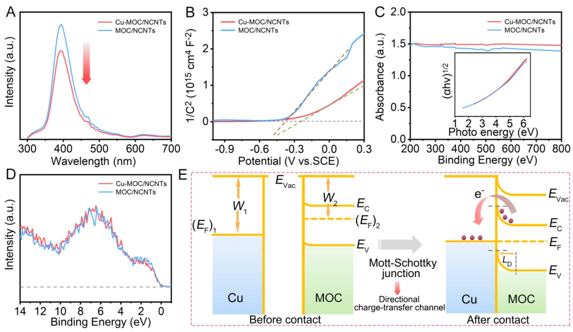 为了进一步探究Cu 量子点对肖特基异质结的界面调控机制(图2),研究人员对复合材料的电荷输运行为和能带结构进行了详细的分析。其中光致发光测试结果表明Cu 加载后复合材料的电荷转移速率明显增强;肖特基曲线测试结果表明Cu加载后曲线斜率明显降低,材料内部电荷载流子密度得到提升;紫外可见漫反射光谱和X-射线光电子能谱价带谱测试结果表明Cu 量子点的引入只改变了电子的流动方向,导致载流子密度和势垒区的能带弯曲,带隙能和价带位置并未发生明显变化。正如量子点加载前后异质结能带结构示意图(图2E)所示,由于定向电荷转移通道的引入,复合材料界面电场得到了显著增强,更多的电子可以快速参与氧化还原反应,提高了电荷转移动力学。此工作立足于解决能源领域的前沿问题,取得的理论创新成果为钠离子电池电极材料提供了一种全新的设计理念,对先进储能/转换材料的商用开发具有重要意义。