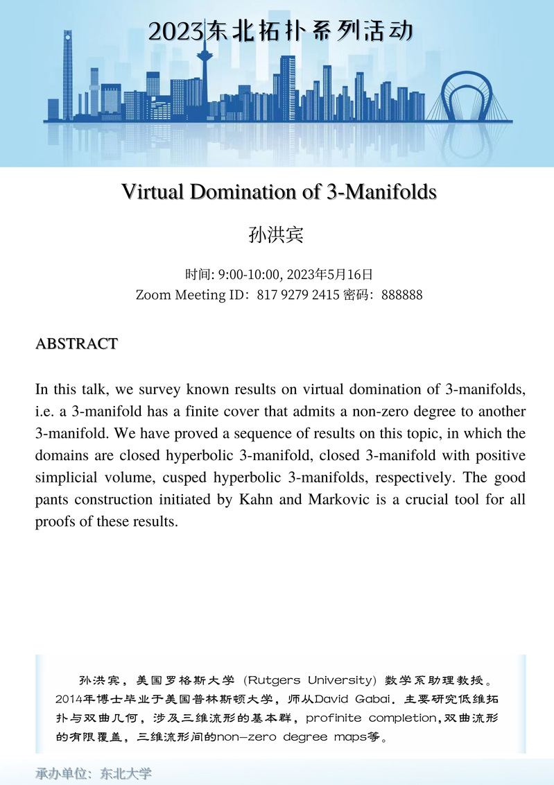 东北拓扑系列活动由东北大学数学系谷世杰教授牵头,联合东北师范大学陈亮教授,大连理工大学李风玲教授,延边大学钟立楠教授和大连海事大学鄂强副教授组织筹备开展。期望促进东北地区拓扑学者与国内外同行的交流。活动将以线上线下混合的方式进行,并将线上参会链接分享给组织承办学校的学生和感兴趣的同行。