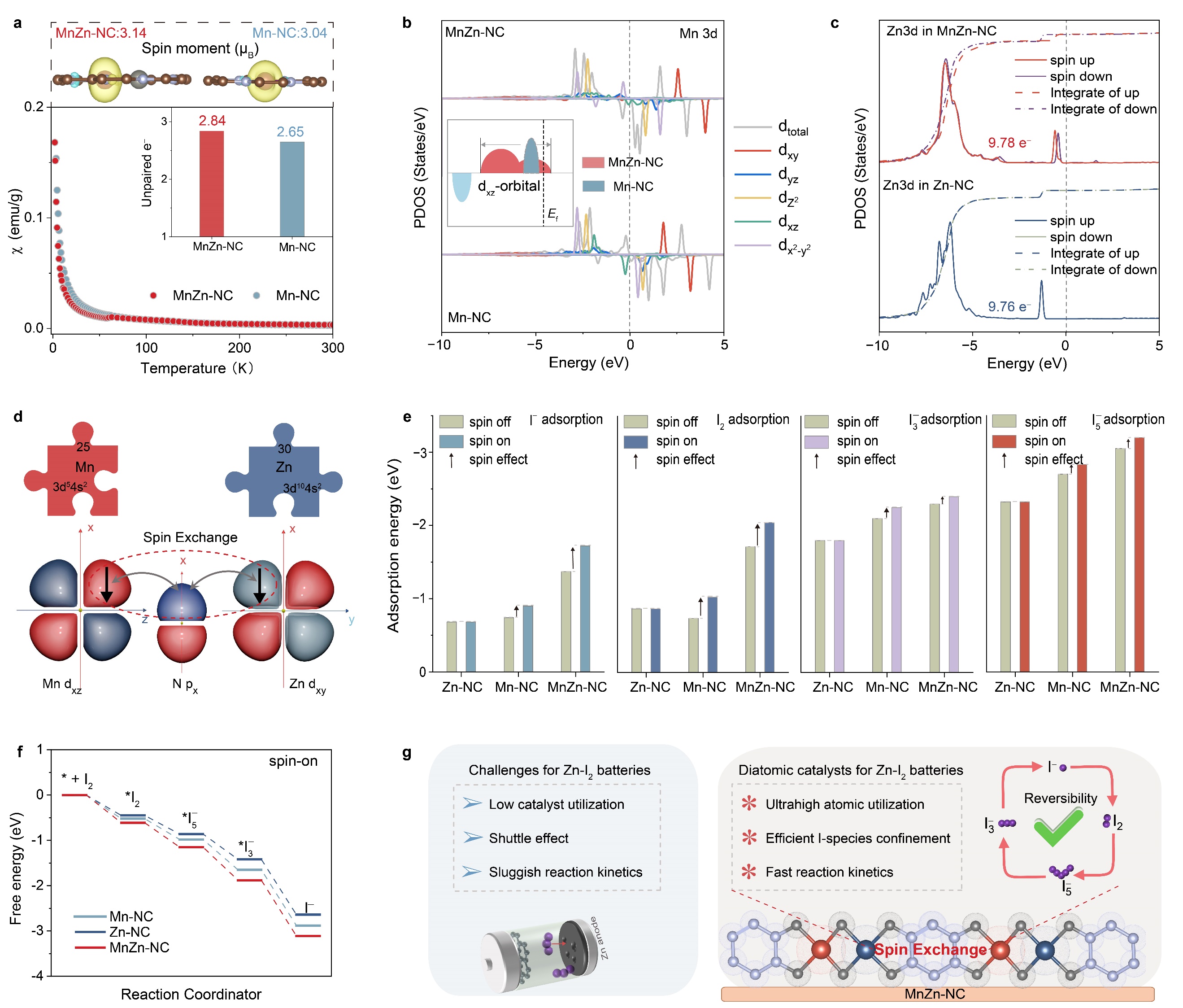 实验结果与理论计算表明, Mn-Zn双原子间借助自旋交换作用协同优化二者电子结构,增强Mn金属性,提升Zn原子d带中心,促进了MnZn-NC与碘物种之间的化学相互作用。该原理同样适用于其他双金属M-Zn-NC (M=Fe, Co, Ni和Cu)催化剂,具备良好的普适性。