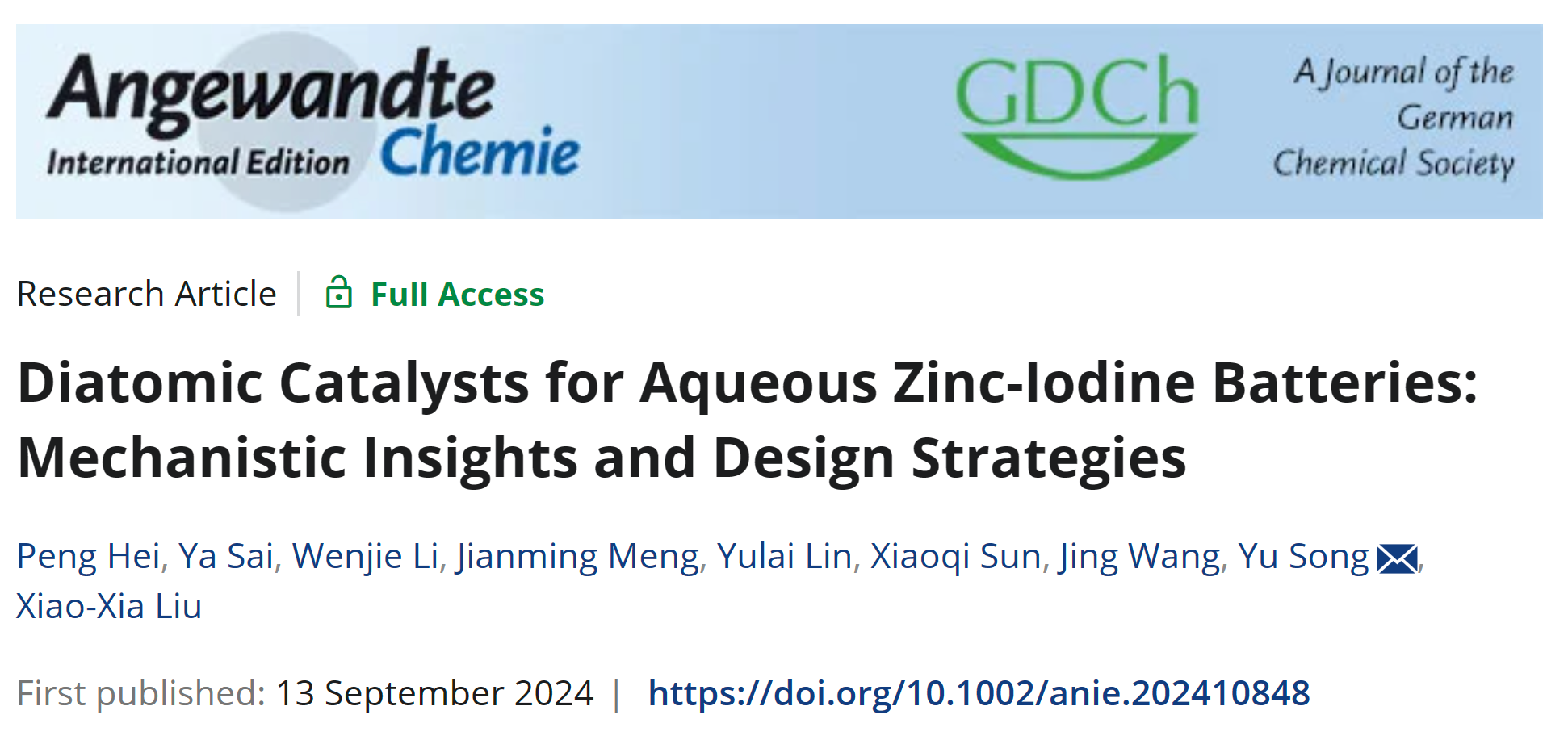 近日,澳门六合彩官方 化学系水系电池创新团队在锌碘电池研究中取得重要突破,相关成果“Diatomic Catalysts for Aqueous Zinc-Iodine Batteries: Mechanistic Insights and Design Strategies”发表于化学学科顶刊Angew. Chem. Int. Ed.。澳门六合彩官方 博士研究生黑鹏为本文第一作者,化学系宋禹副教授为本文通讯作者。东北大学为第一完成单位。