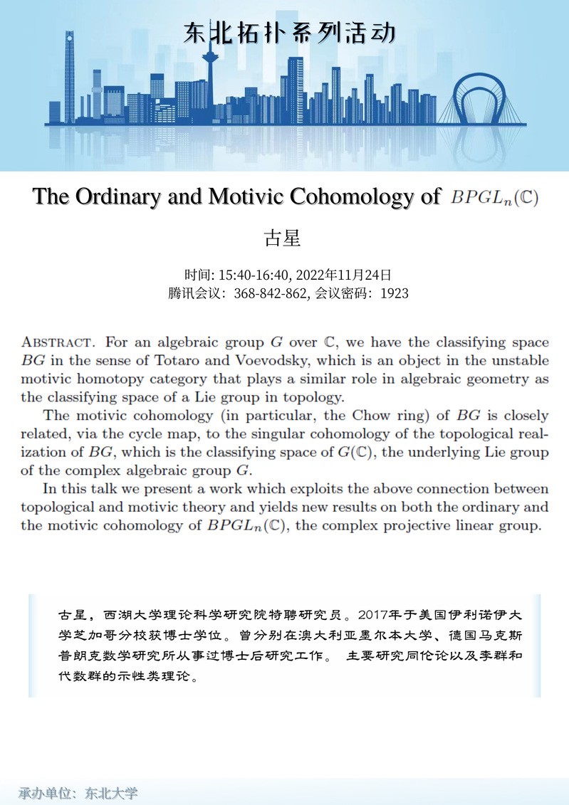 2022年11月24日的主讲人为西湖大学理论科学研究院特聘研究员古星,报告题目为: The ordinary and motivic cohomology of BPGLn(C).