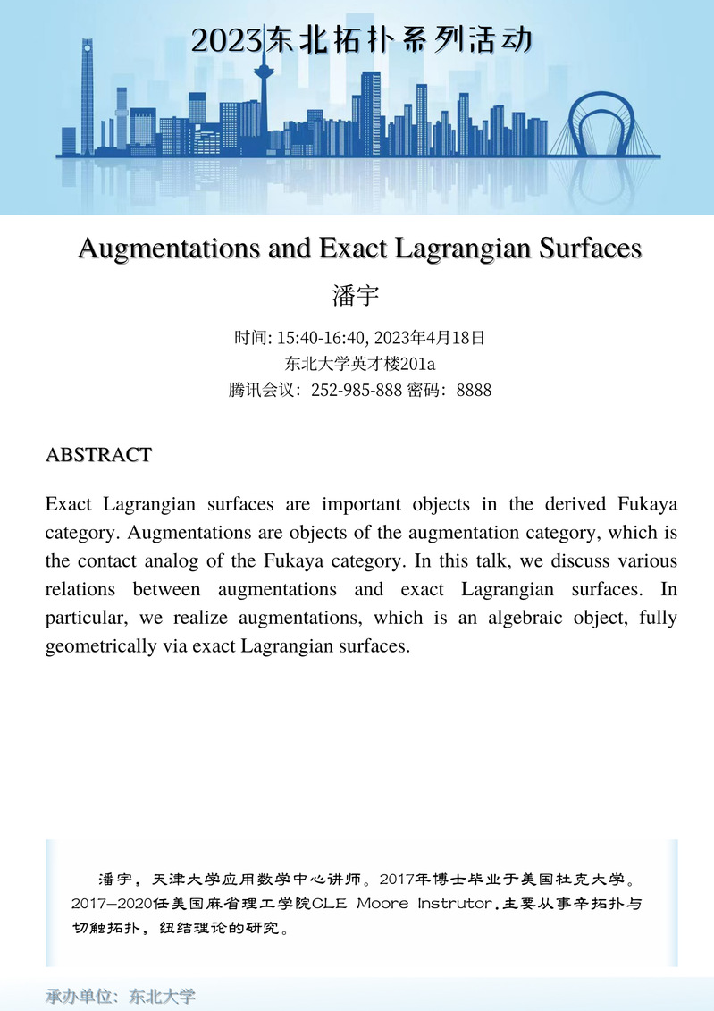 2023年4月18日的报告人为清华大学丘成桐数学中心黄意和天津大学应用数学中心潘宇。