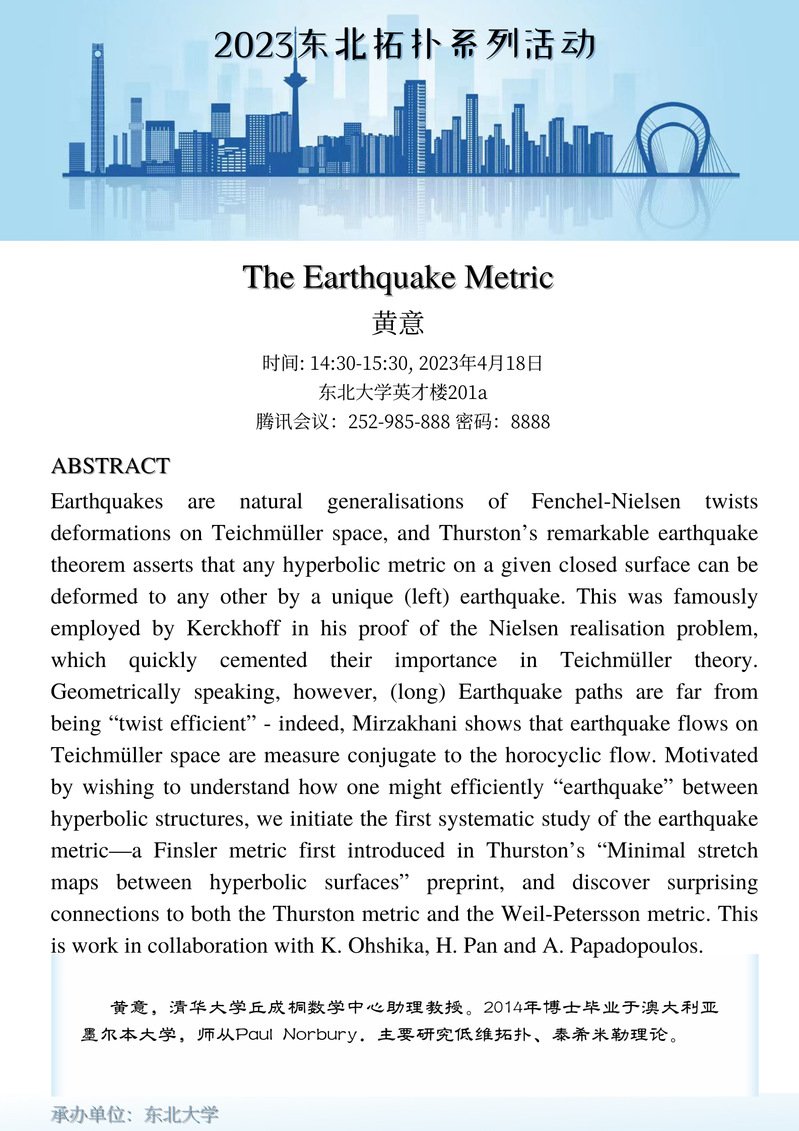 东北拓扑系列活动由东北大学数学系谷世杰教授牵头,联合东北师范大学陈亮教授,大连理工大学李凤玲教授,延边大学钟立楠教授和大连海事大学鄂强副教授组织筹备开展。期望促进东北地区拓扑学者与国内外同行的交流。活动将以线上线下混合的方式进行,并线上参会链接将分享给组织承办学校的学生和感兴趣的同行。