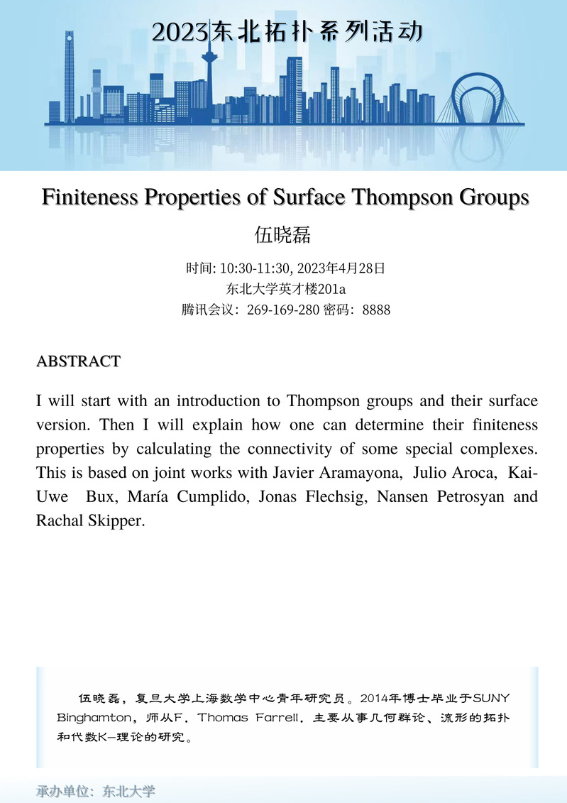 2023年4月28日的报告人为复旦大学上海数学中心伍晓磊(10:30-11:30)和南开大学数学科学学院徐彬斌(14:00-15:00)。